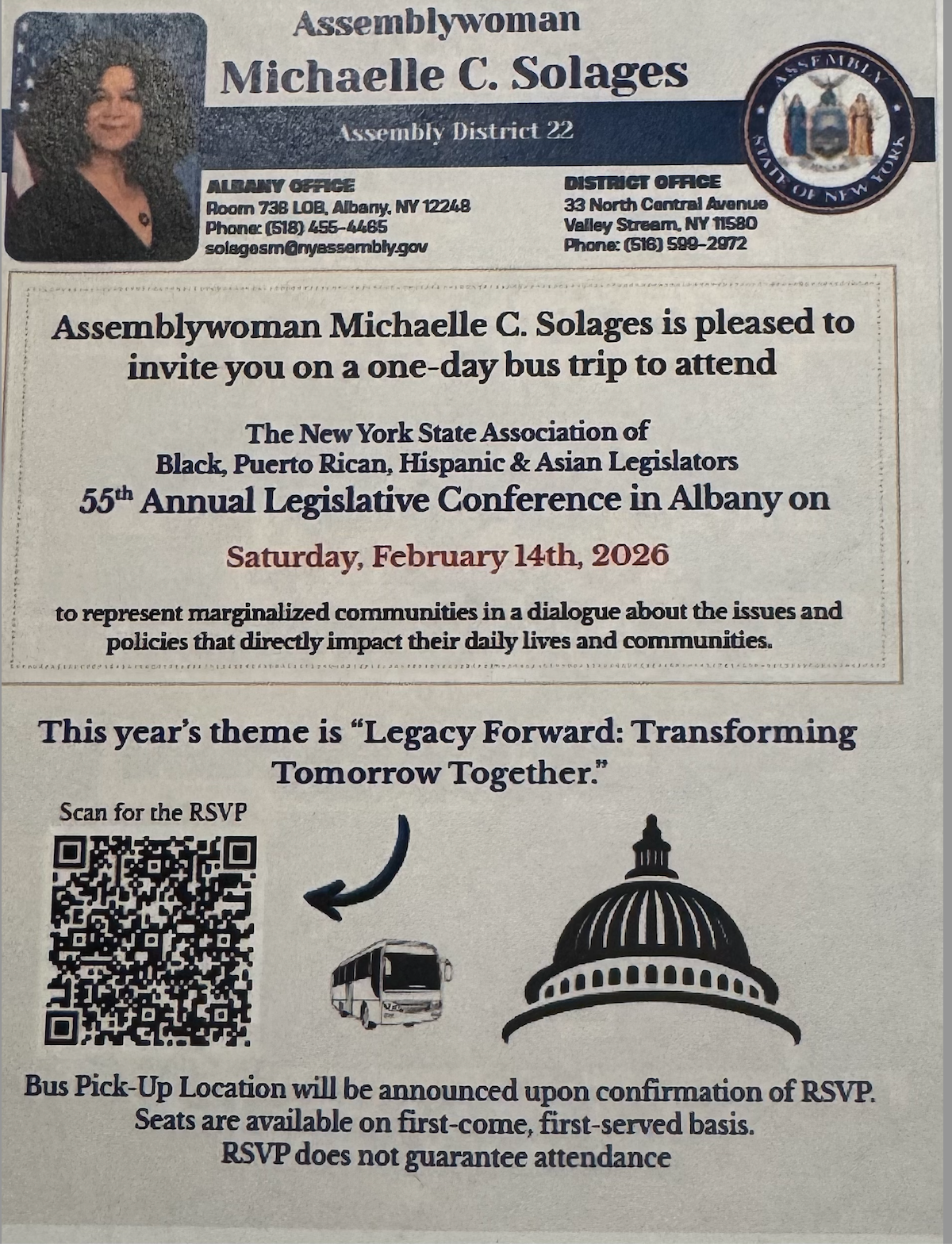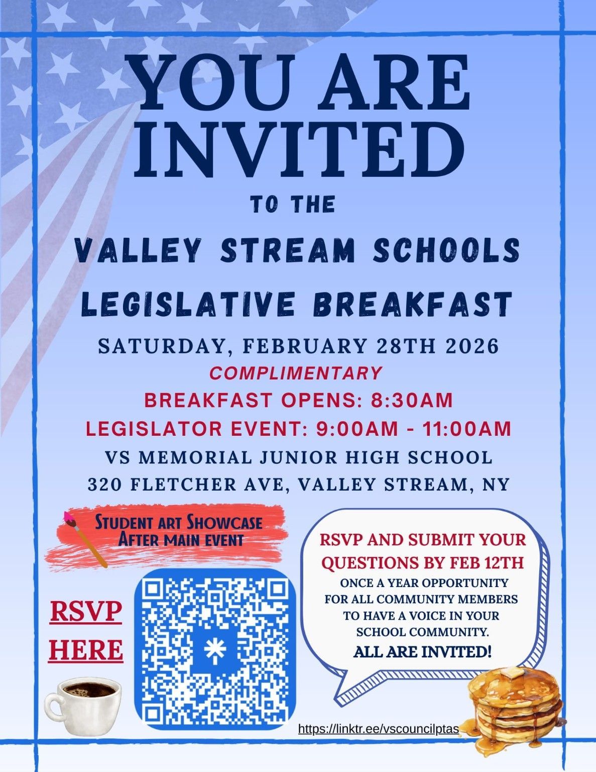 The Valley Stream Council of PTAs invites all parents, guardians, and community members to attend the 2026 Valley Stream Schools Legislative Breakfast. This annual event provides a valuable opportunity to engage directly with elected officials and school leadership on matters that affect our schools and students.