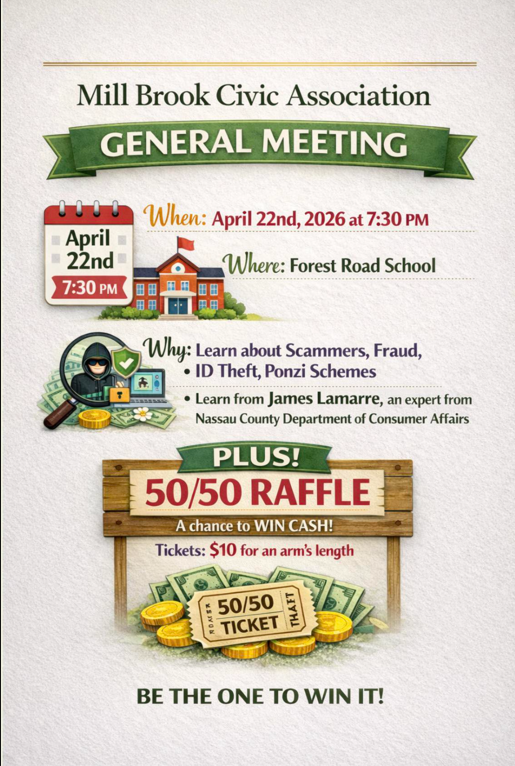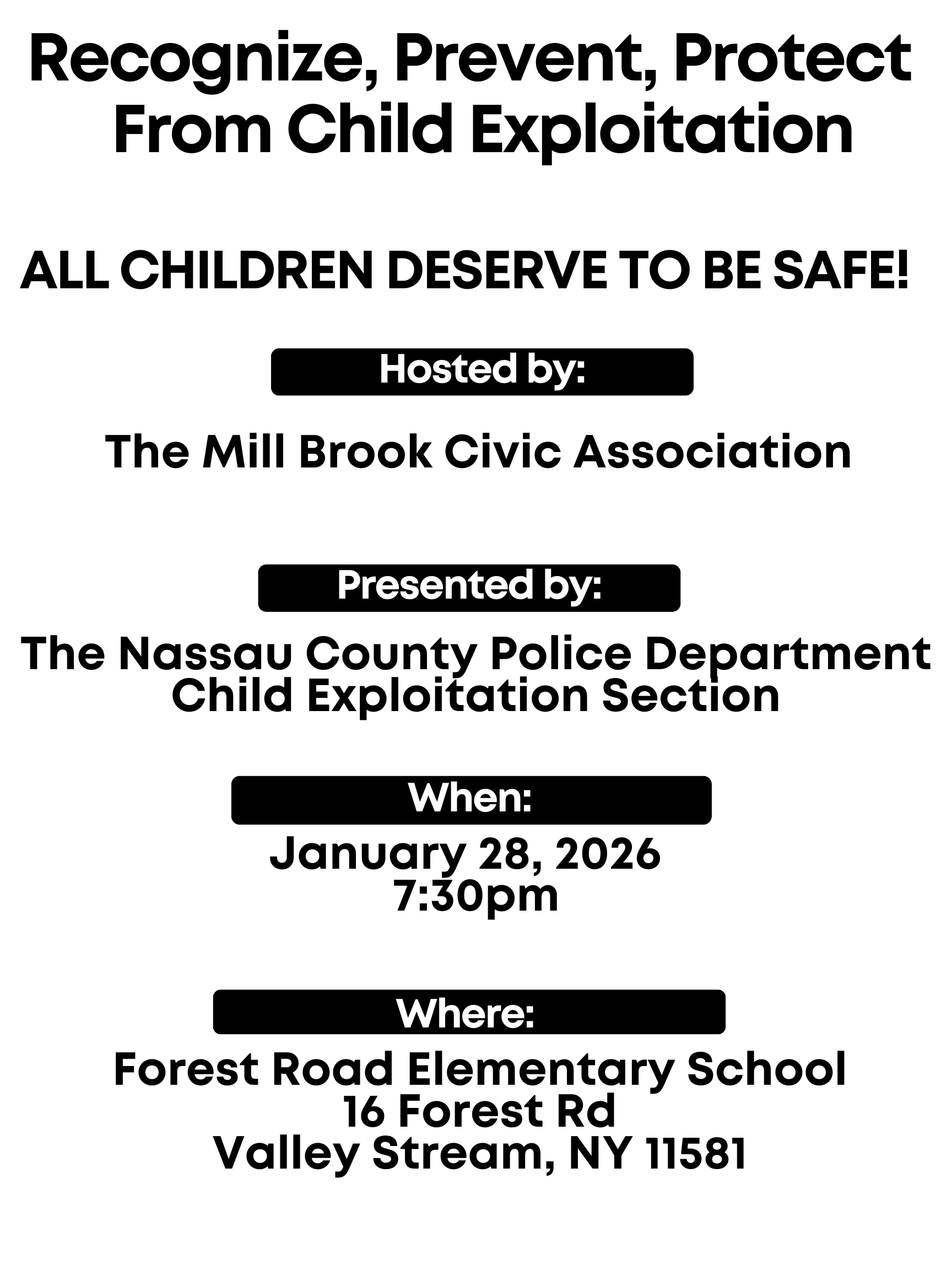 The Mill Brook Civic Association is proud to host an important community safety presentation in partnership with the Nassau County Police Department Child Exploitation Section.