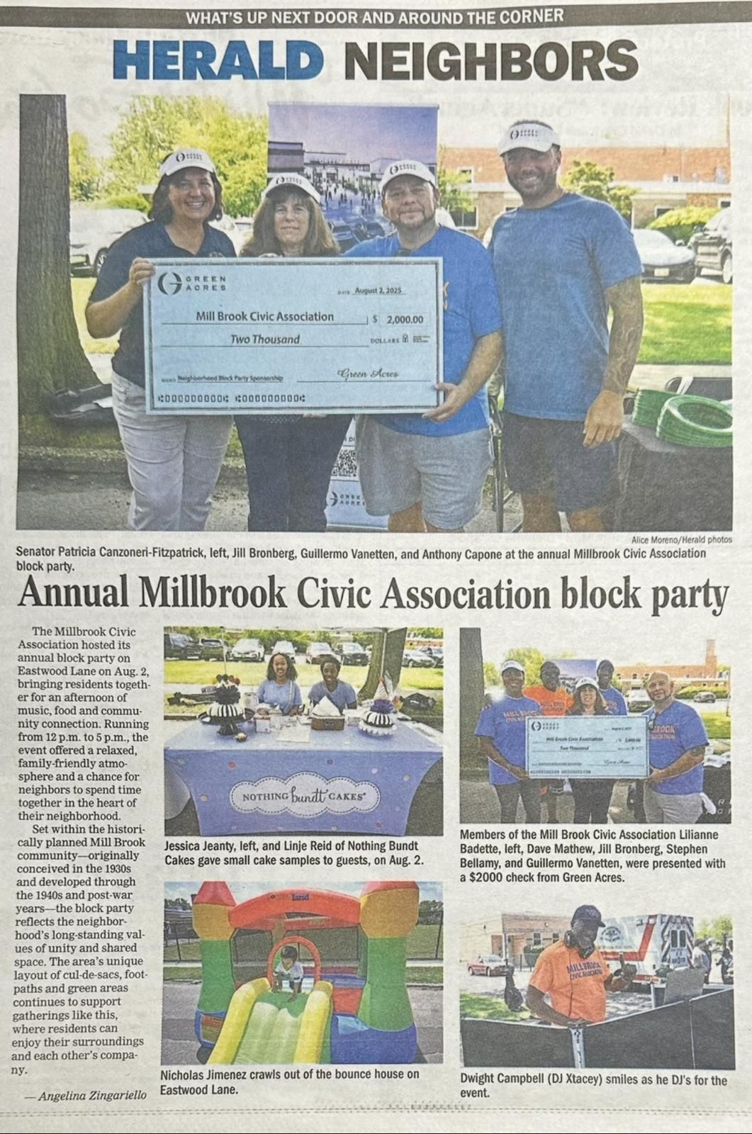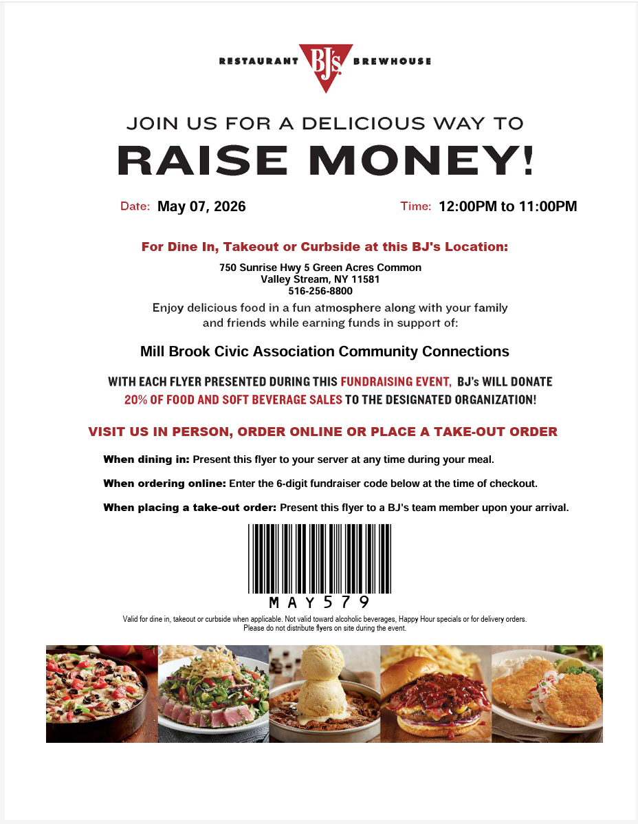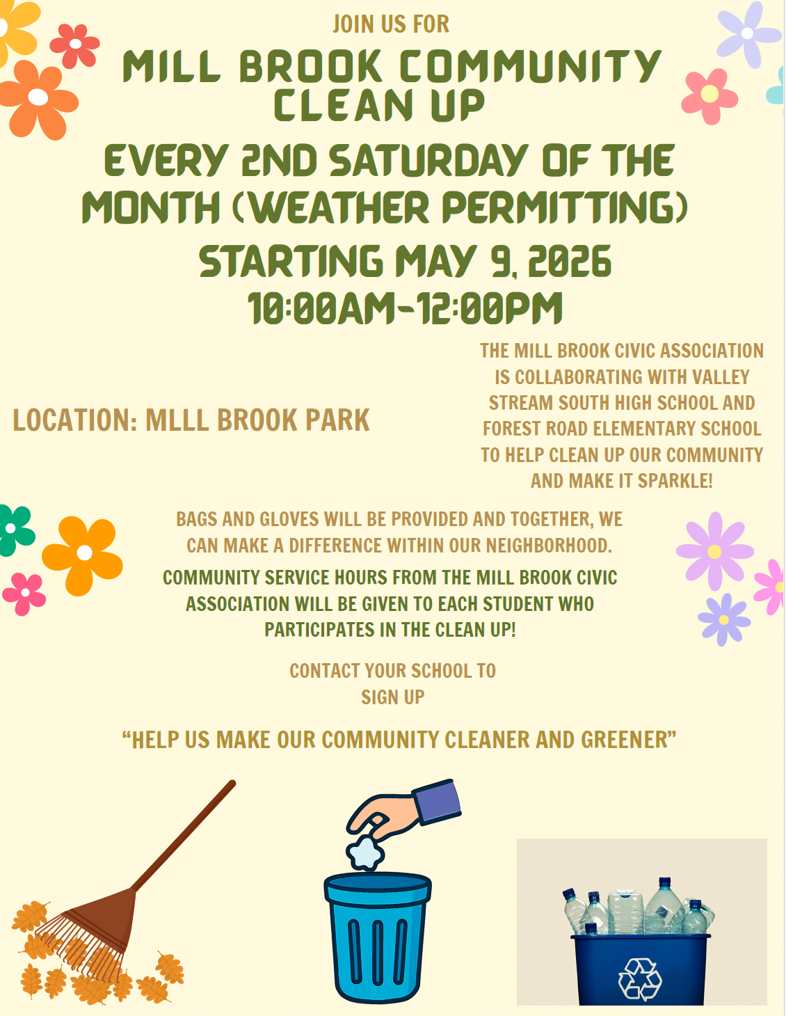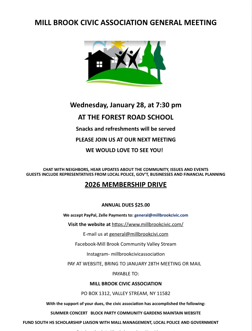 - Mail checks payable to Mill Brook Civic Association to PO Box 1312, Valley Stream, NY 11582