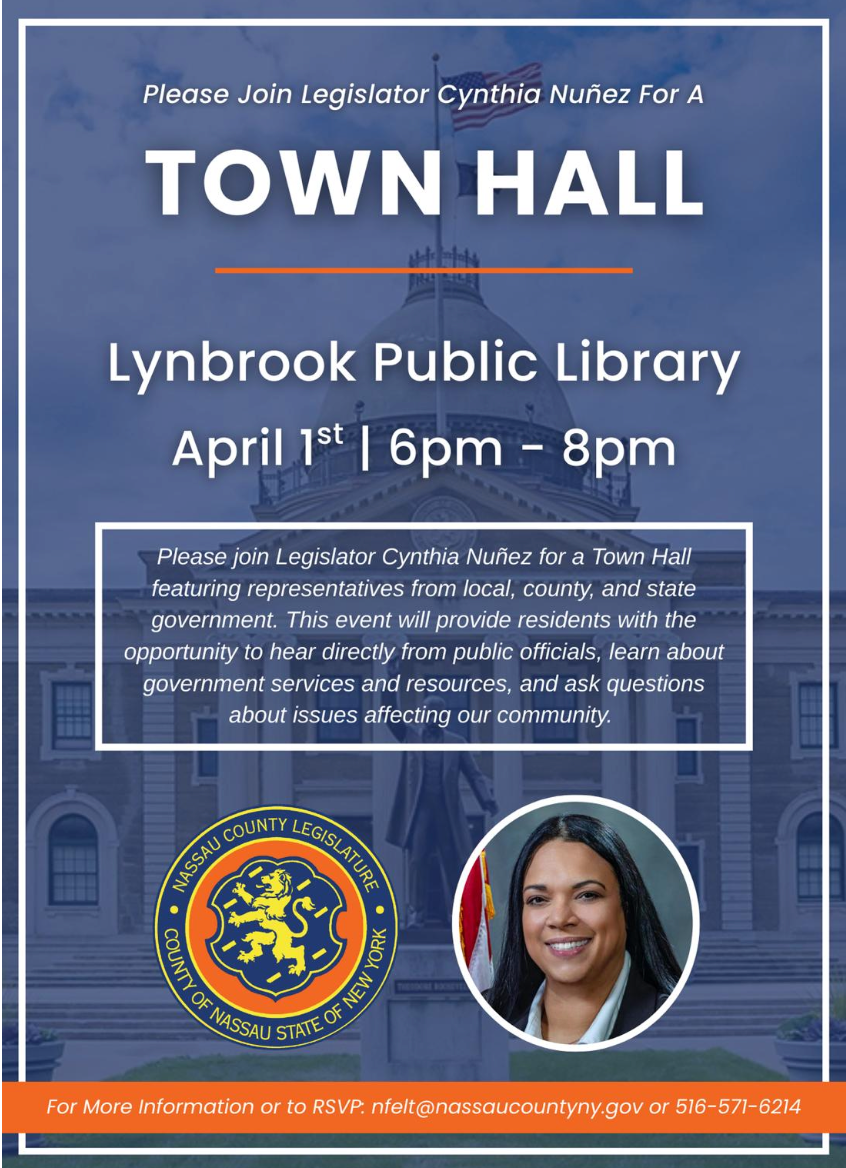 Residents are invited to join Legislator Cynthia Nuñez for a Town Hall meeting featuring representatives from local, county, and state government. Attendees will have the opportunity to learn about government services and resources while sharing questions and concerns impacting the community.