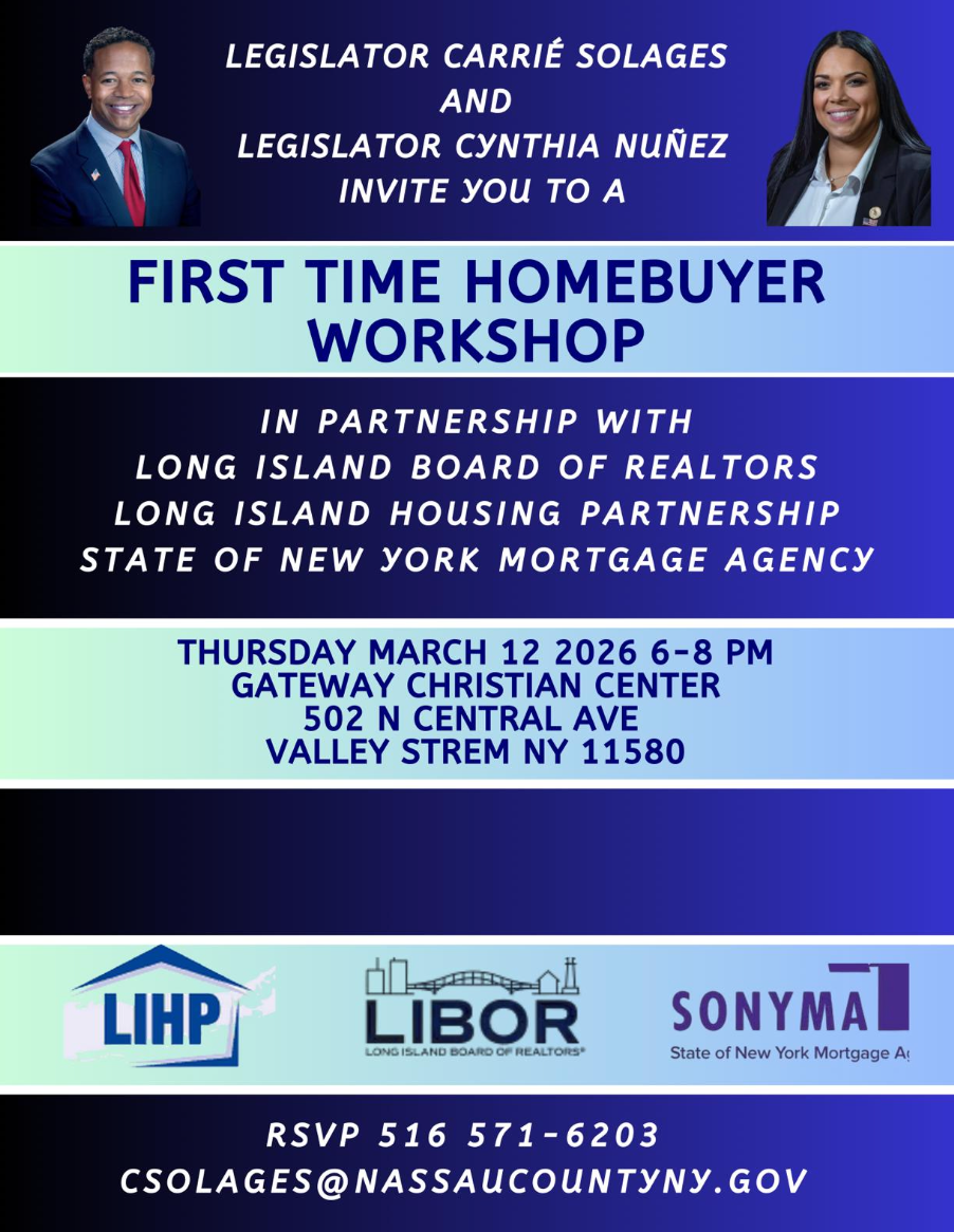 This informative workshop will help residents learn about the homebuying process, available mortgage programs, and resources for first-time homebuyers. The event is held in partnership with the Long Island Board of Realtors, Long Island Housing Partnership, and the State of New York Mortgage Agency.
