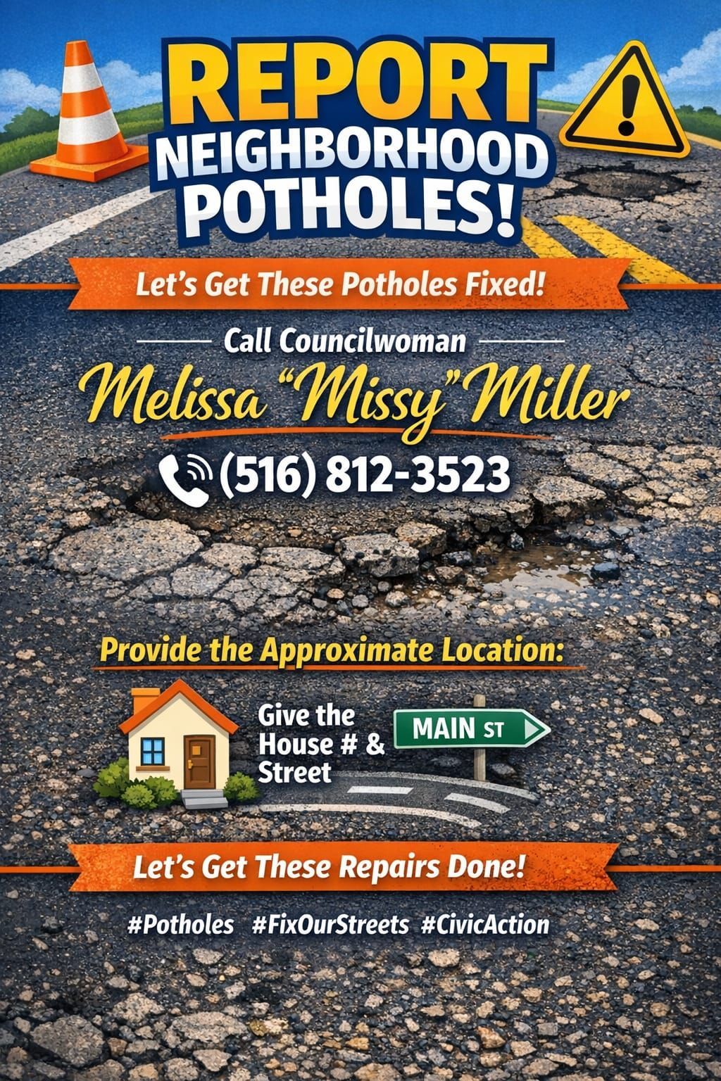Residents are encouraged to report potholes directly to Councilwoman Melissa “Missy” Miller’s office so the information can be forwarded to the appropriate department for repairs.